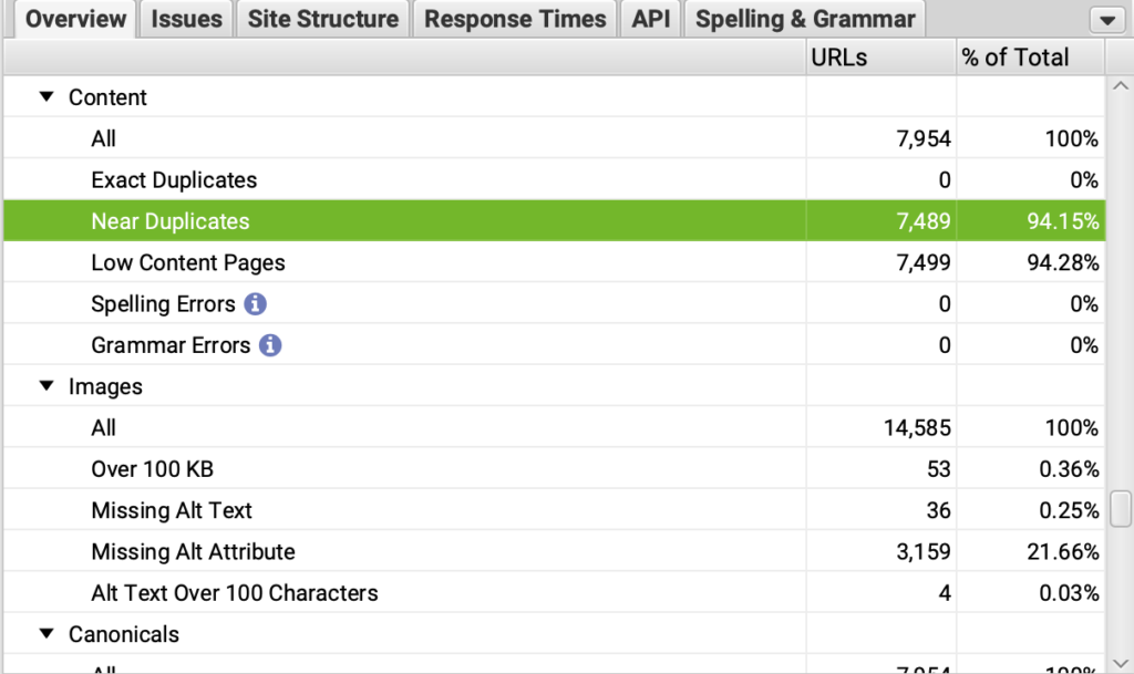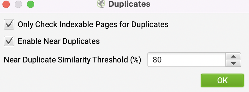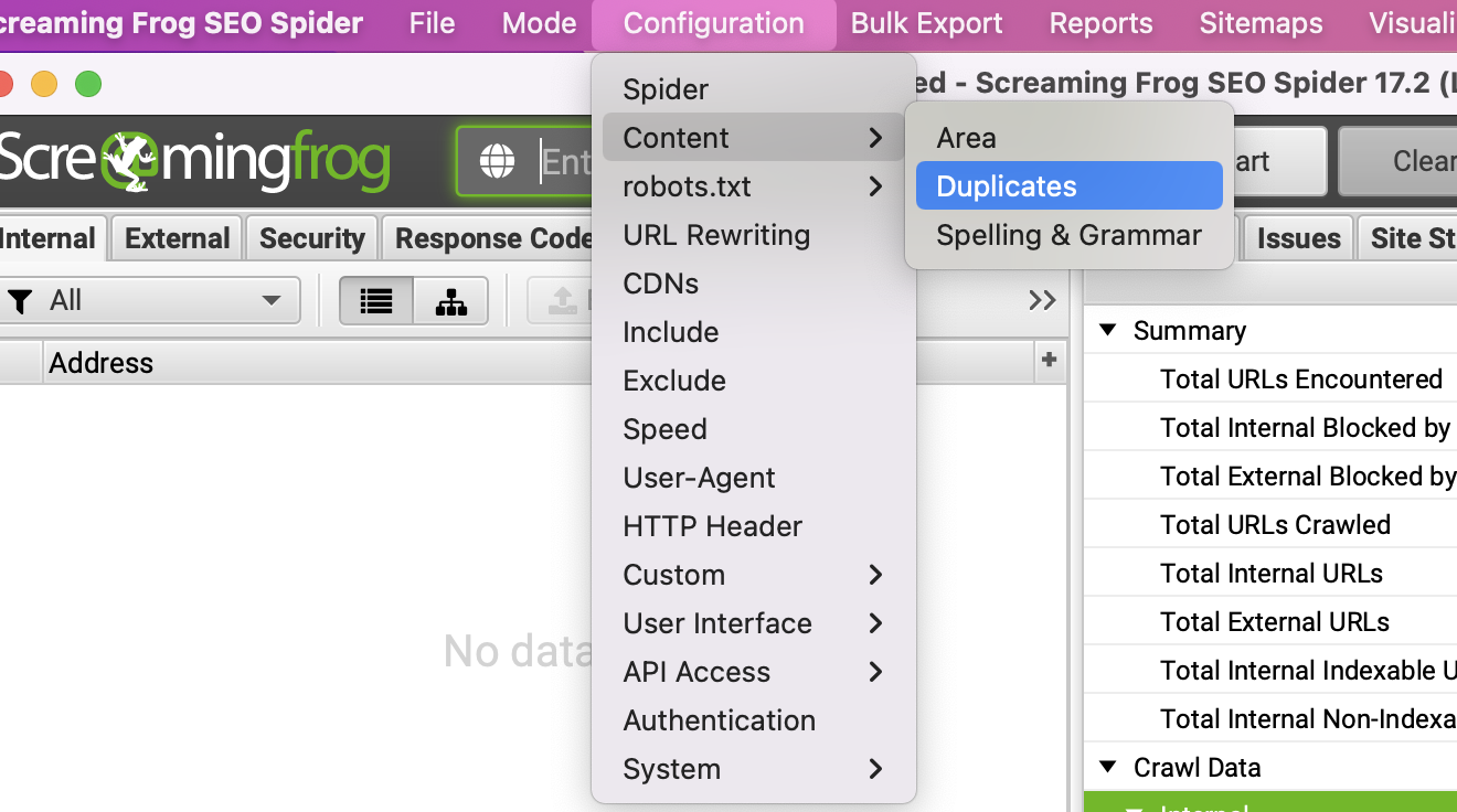 In your Screaming Frog crawl, go to the ‘Content’ tab, click on the ‘Filter’ bar to see Exact and Near Duplicates.
