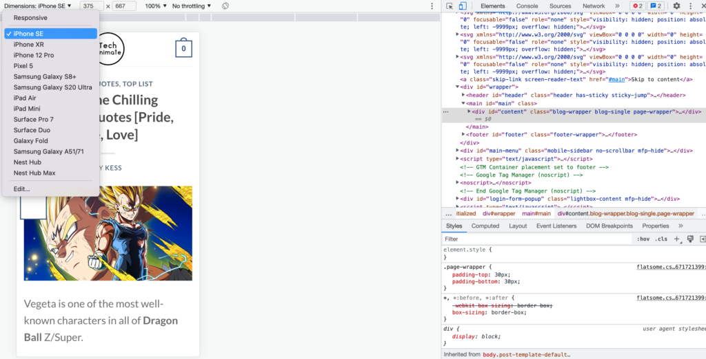 - Use the drop down menu to view your website from different phones. (this method isn’t always an accurate representation of what your website looks like from a particular device. That’s why it’s best to use a physical phone)