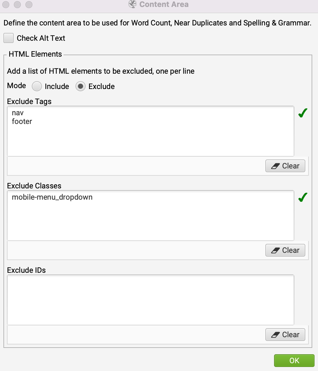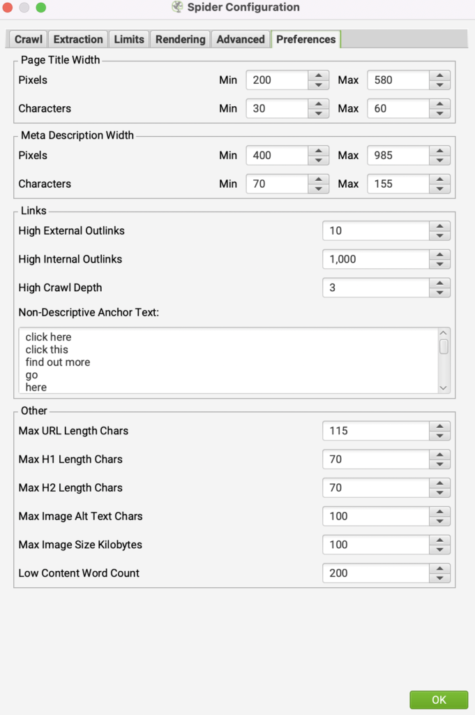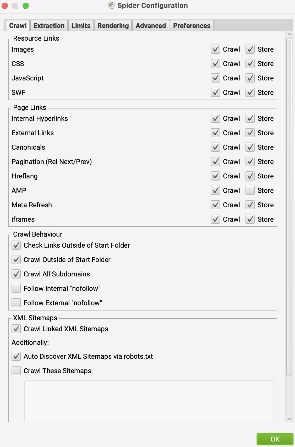 2. Click on ‘Configuration’ > ‘Spider’ and copy the configuration below and click ‘OK’ (if you know what your sitemap link(s) is, you can also include that.)