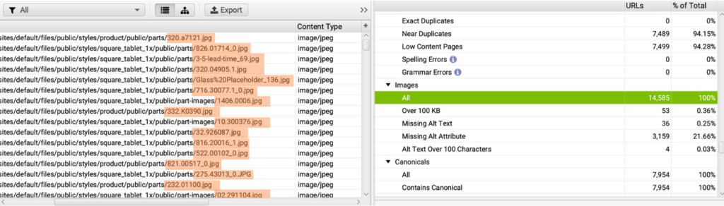 - Run the Screaming Frog crawl, click on ‘All’ under ‘Images’.
